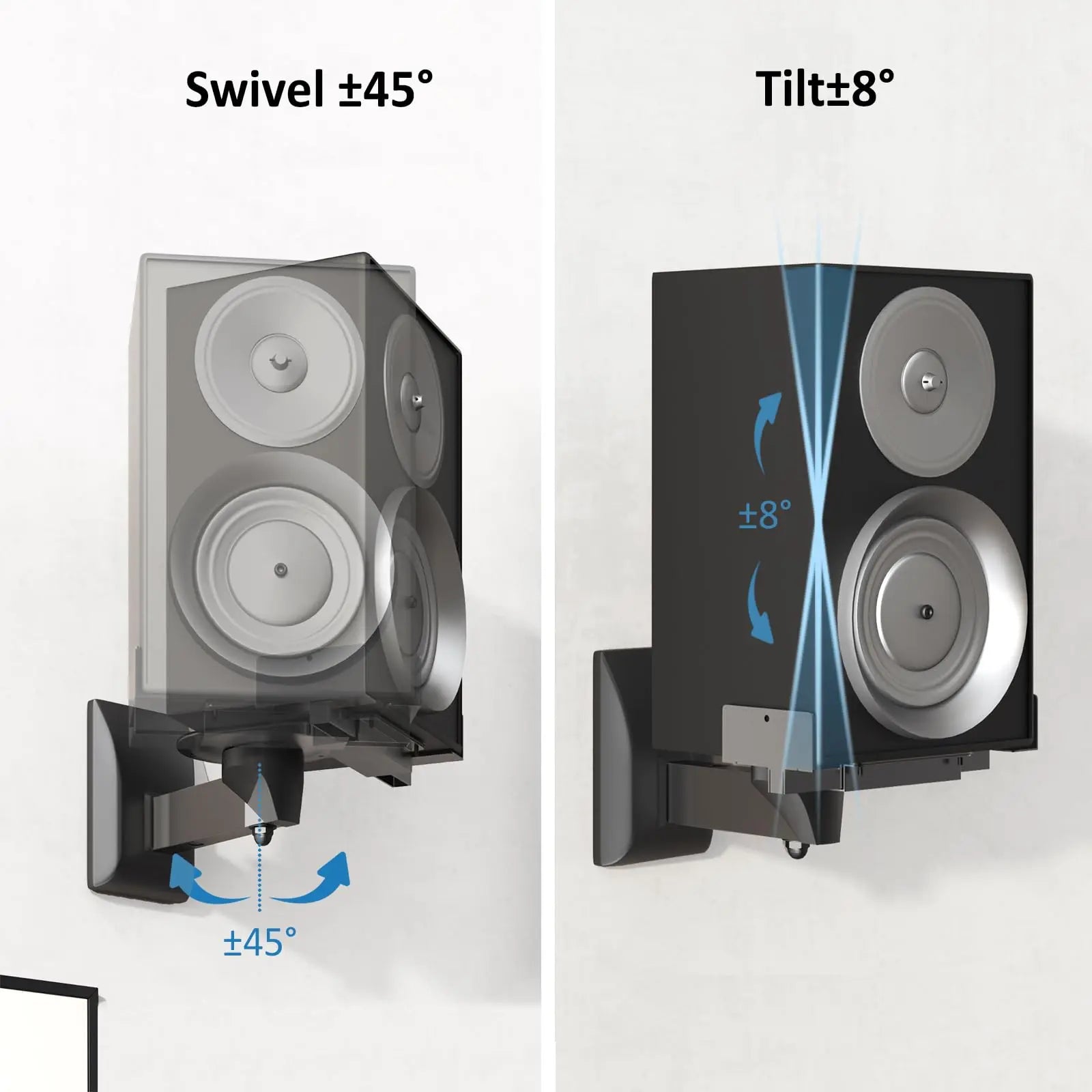 - For an optimal listening experience: wall mount speaker can be tilted up and down by 8 degrees and swiveled left and right by 45 degrees, easy swiveling and positioning for an optimal listening experience