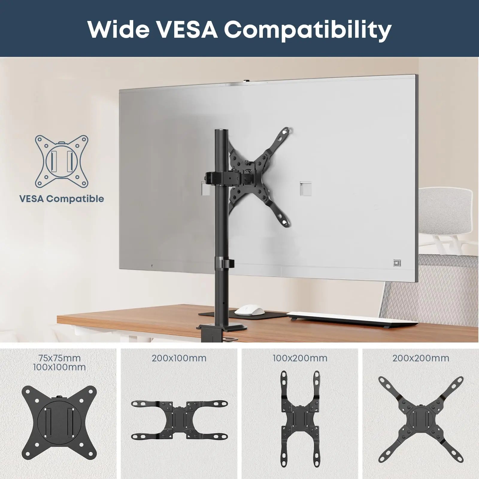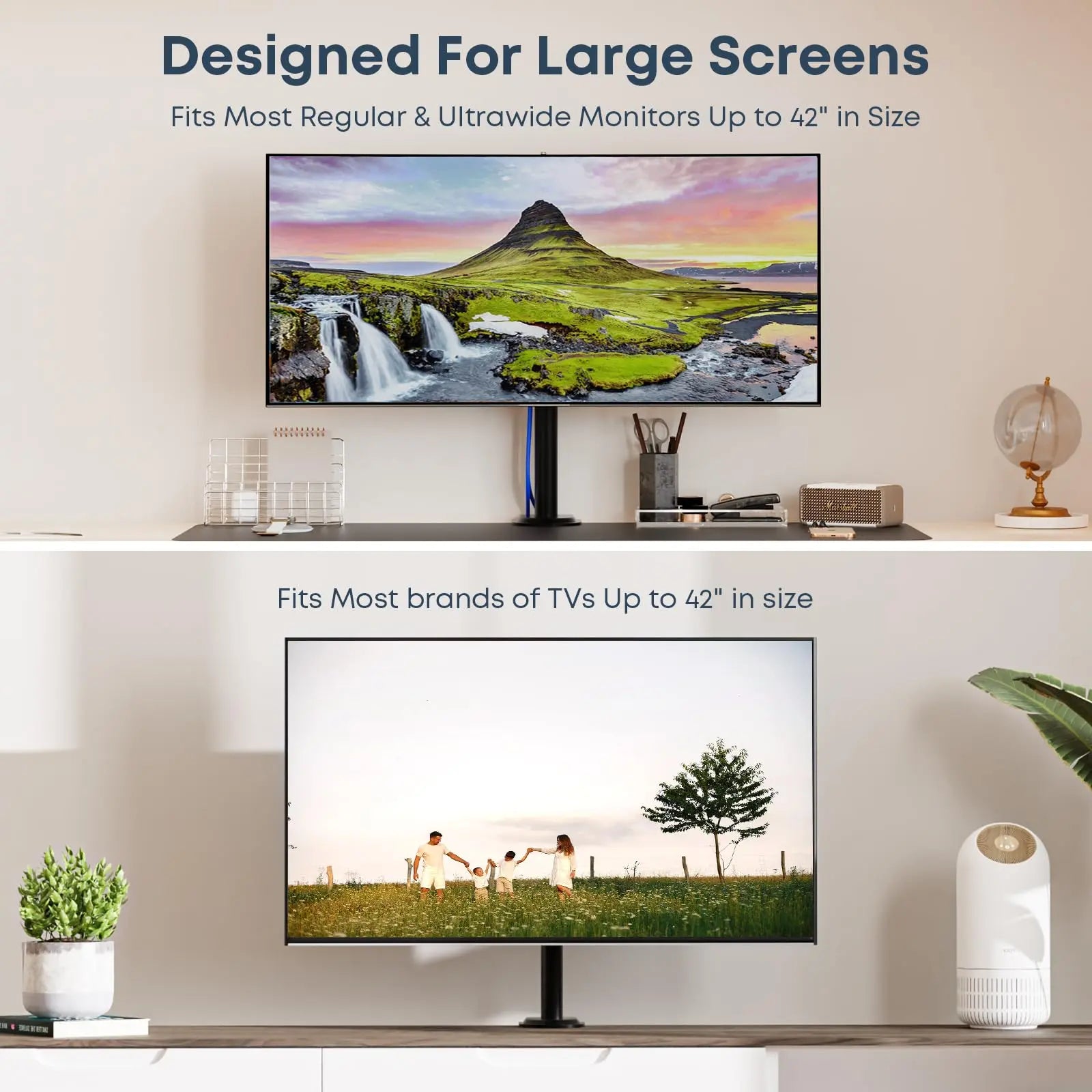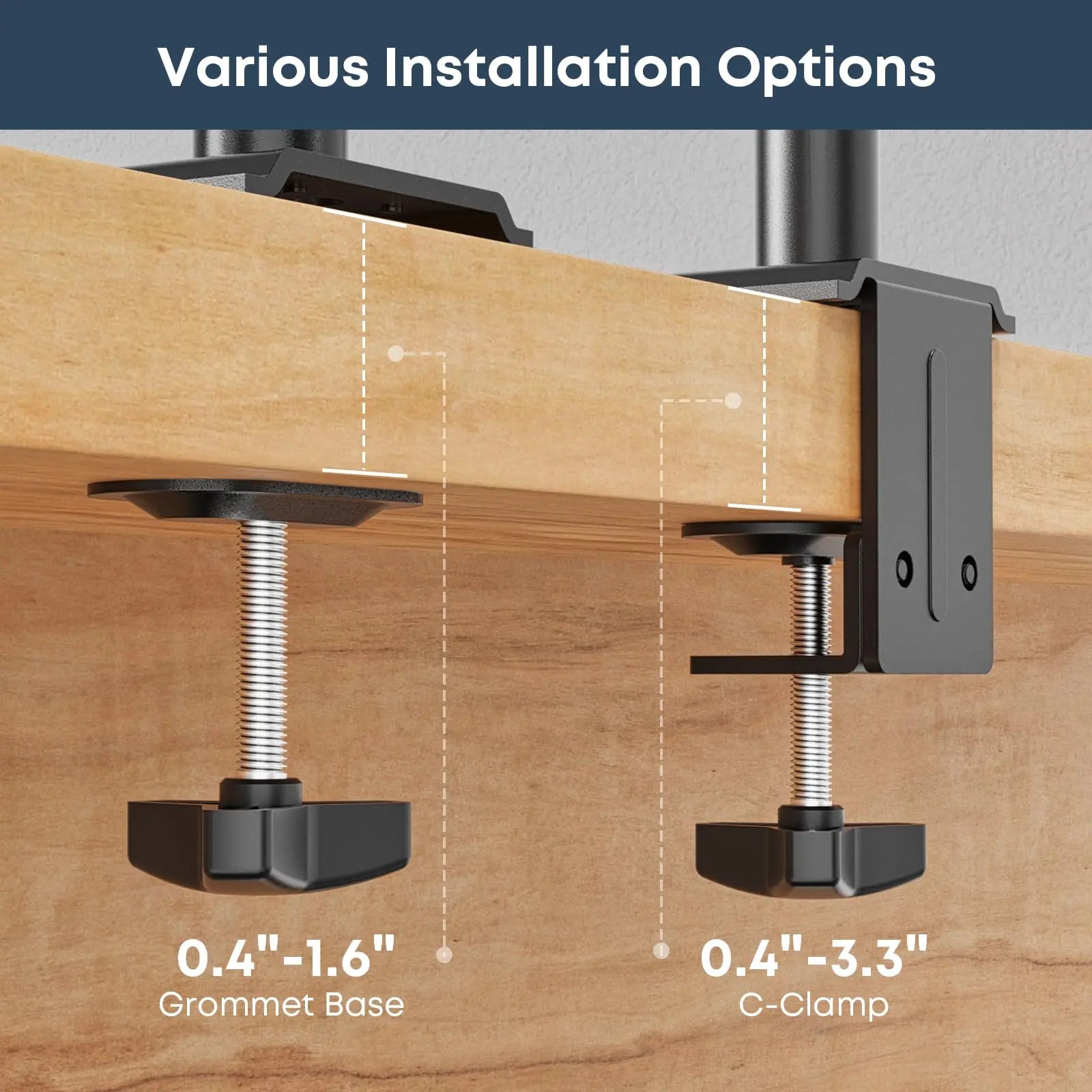 Ultra wide screen monitor mount: Fits most ultra wide screen monitors, normal monitors and TVs up to 42 inches and weighing up to 12kg. Please check the weight of the monitor and TV, the VESA hole (suitable for 75x75mm, 100x100mm, 200x100mm and 200x200mm) and the thickness of the table top (clamp for 10~80mm; grommet for 10~40mm) before purchasing.