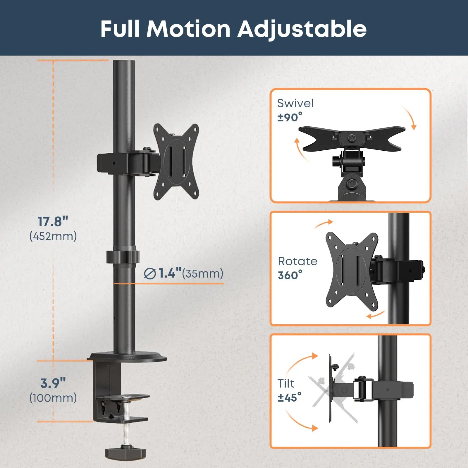 Fully adjustable: The monitor arm can be tilted 90°, swivelled 180° and rotated 360° on the VESA plate. Monitor mount offers ergonomic viewing angles and optimal screen positioning to prevent neck and eye strain as well as shoulder and back pain.