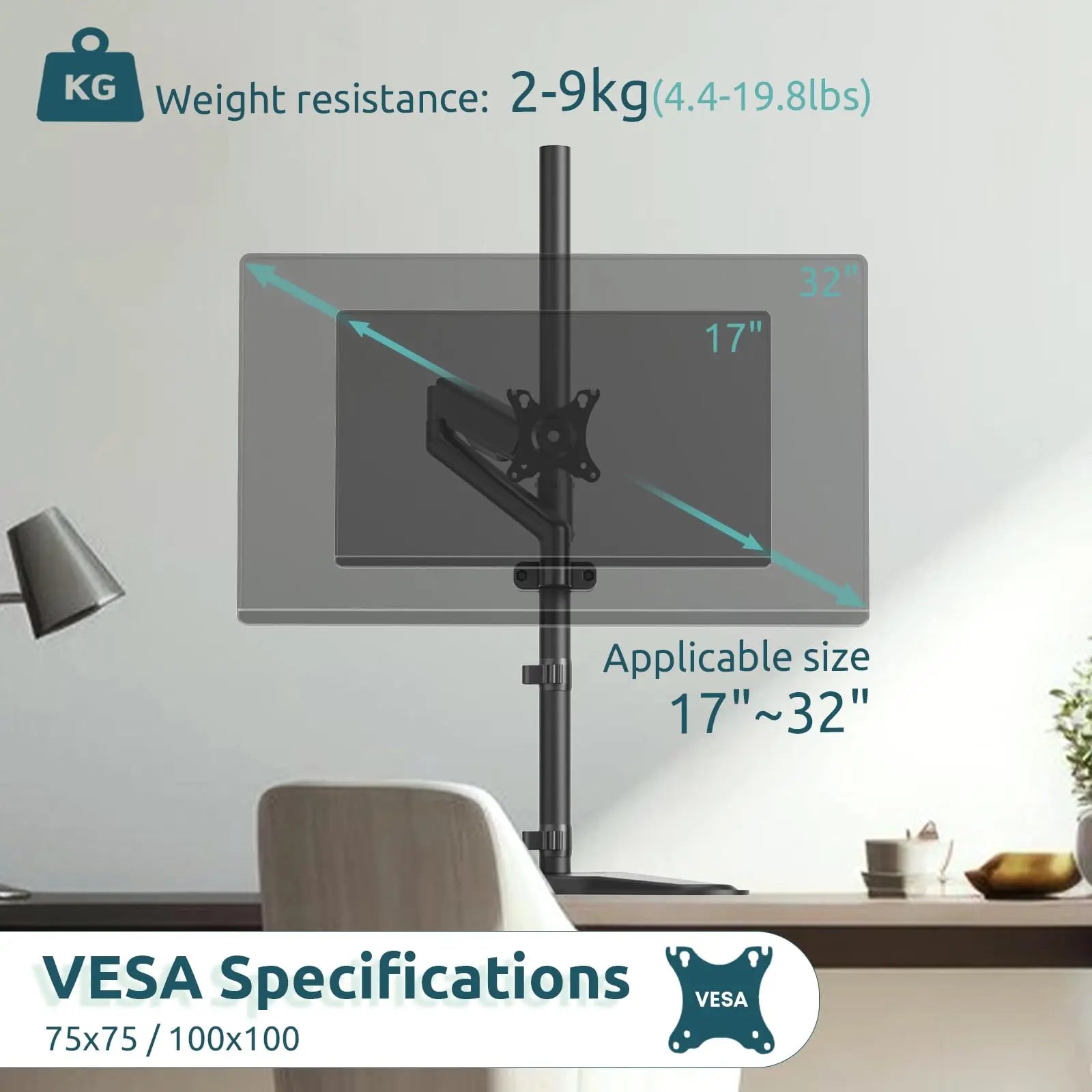 Product specifications: Mechanical universal VESA mount for attachment to support posts. Compatible with round tubes with a diameter of 28-60 mm. Supports monitors from 17 to 32 inches, with a load capacity of 2-9 kg and VESA standards of 75×75 mm and 100×100 mm (pole not included)