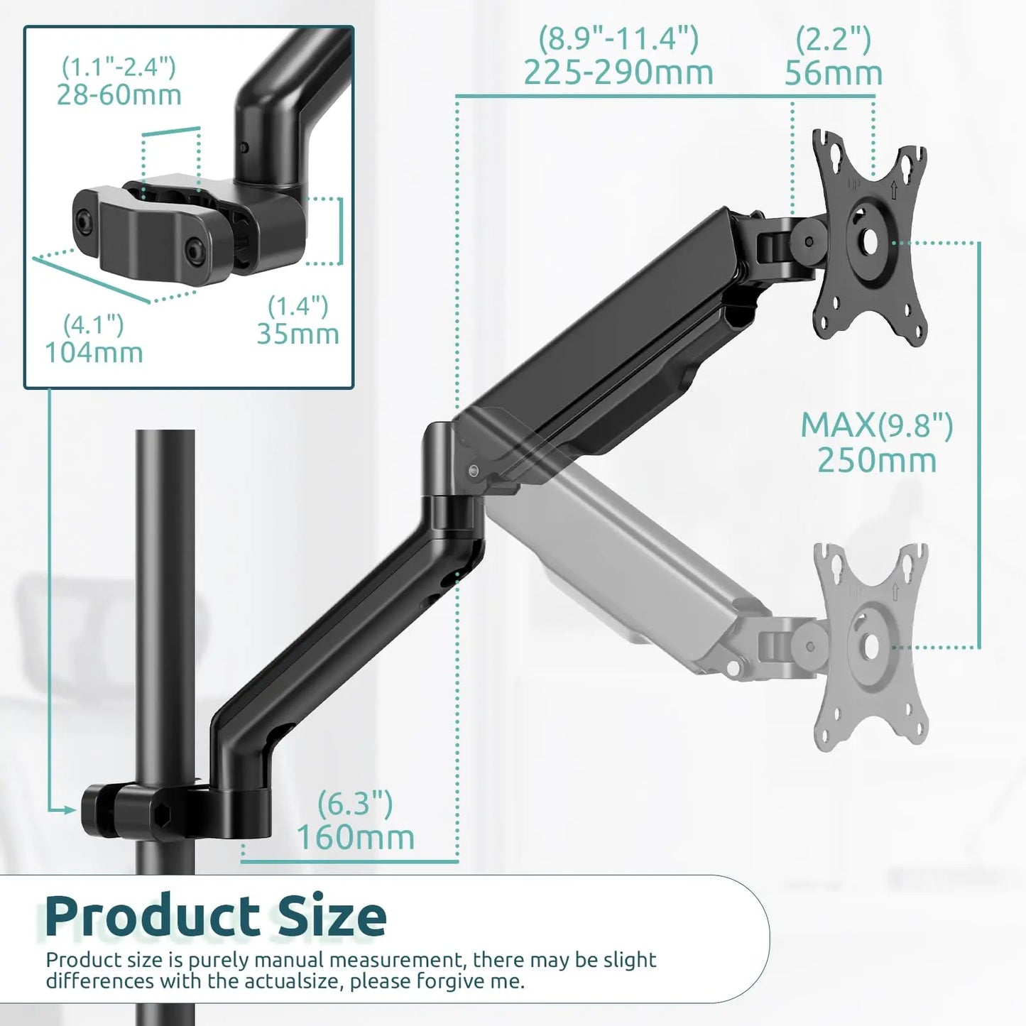 Height adjustment: This product has a built-in mechanical spring for smooth vertical adjustment. The height adjustment range is 250 mm. Arm length up to 450 mm.(Detailed dimensions are shown in the picture on the product page)