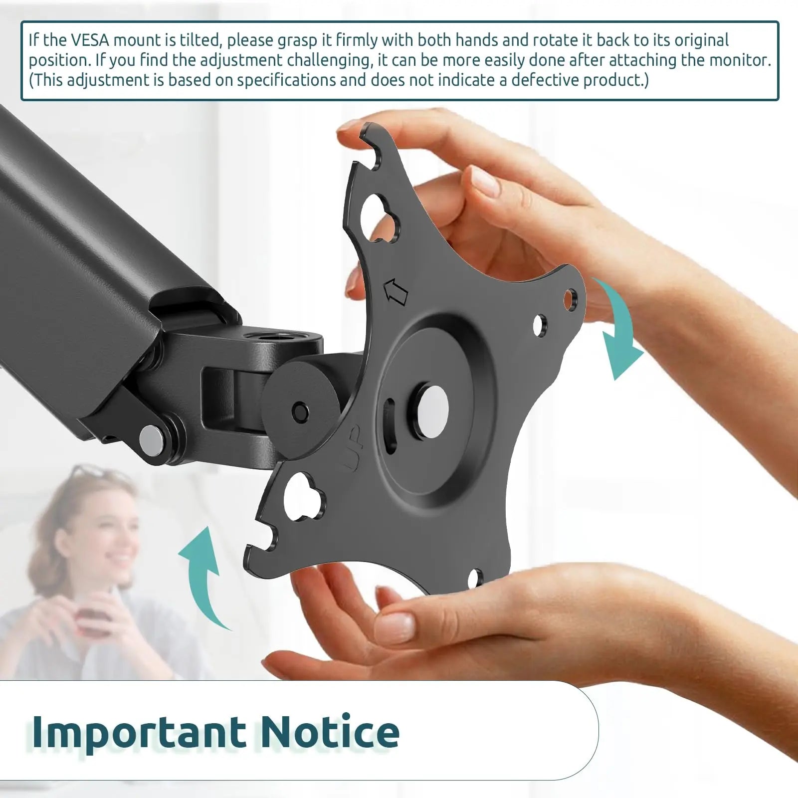 Important: The VESA mount is rotatable. If the VESA part is tilted, rotate it back to the original angle with both hands after mounting on the pole or rack. (If you find it difficult, adjust it after mounting the monitor)